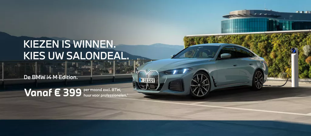 Maandelijkse huurprijs van een financiële renting berekend voor een looptijd van 60 maanden en maximum 75.000 km voor een i4 eDrive35 M Edition met een actieprijs van € 45.347,11 excl. BTW (€ 54.870,00 incl. BTW), mits een voorschot van € 10.050,00 excl. BTW en een restwaarde van € 15.346,63 excl. BTW. Financiële renting richt zich uitsluitend tot professionele klanten die het voertuig gebruiken met het oog op de uitoefening van hun handels-, beroeps-, of ambachtelijke activiteiten. Onder voorbehoud van aanvaarding van het dossier door het kredietcomité van BMW Financial Services Belgium NV, Lodderstraat 16, 2880 Bornem, BE 0451.453.242 – RPR Mechelen. Restwaarde: minimum 16% van de aankoopprijs. Alle prijzen voor professionelen zijn exclusief BTW vermeld en onder voorbehoud van eventuele wijzigingen en vergissingen. Actie is niet cumuleerbaar. Actie geldig van 01/12/2025 tot en met 31/01/2026. Enkel geldig bij deelnemende BMW Verdelers. Als particuliere klant verwijzen we u graag door naar uw BMW Verdeler voor een financiële offerte op maat.